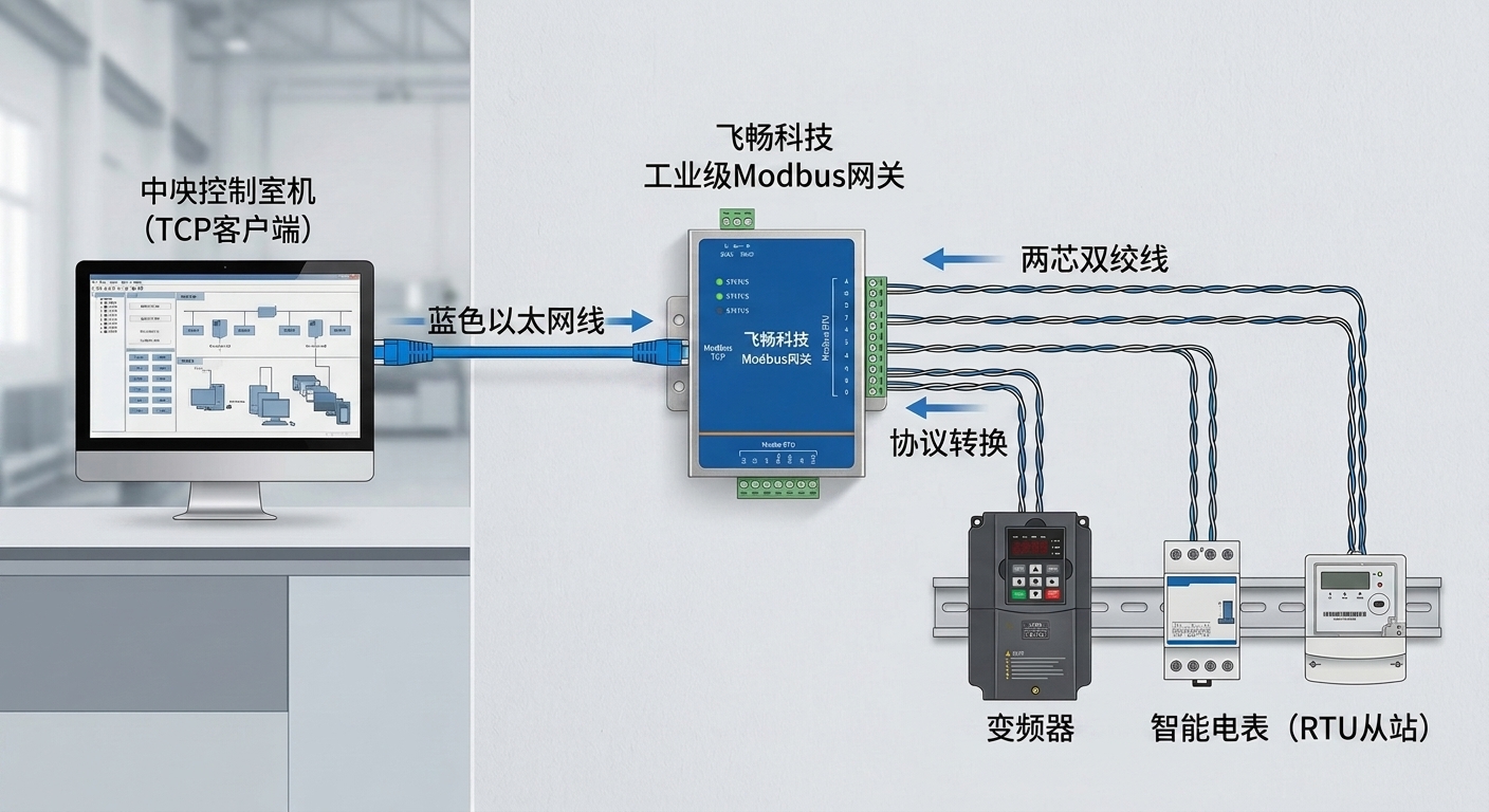 在飛暢科技接觸的實際項目中,90%的工廠都是“混合網(wǎng)”:現(xiàn)場有幾百塊便宜好用的Modbus RTU儀表,而中控室的SCADA系統(tǒng)只認以太網(wǎng)的Modbus TCP。