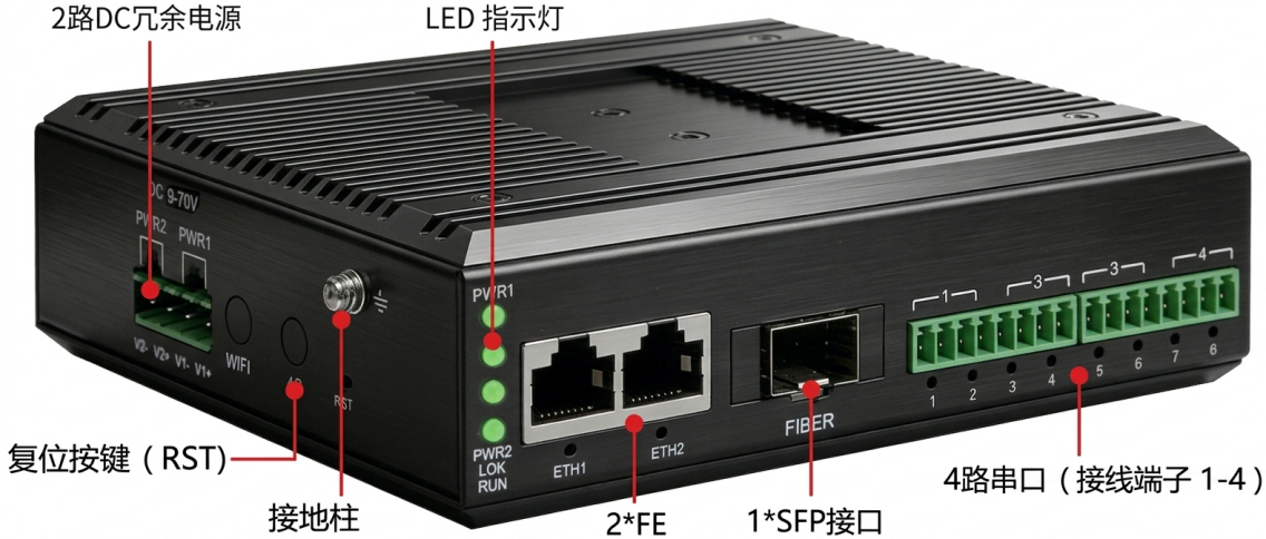 • 4*RS232/422/485軟件可配 • 300bps~921600bps • 2*FE可級(jí)連設(shè)備 • 1*SFP光口遠(yuǎn)傳網(wǎng)絡(luò) |
