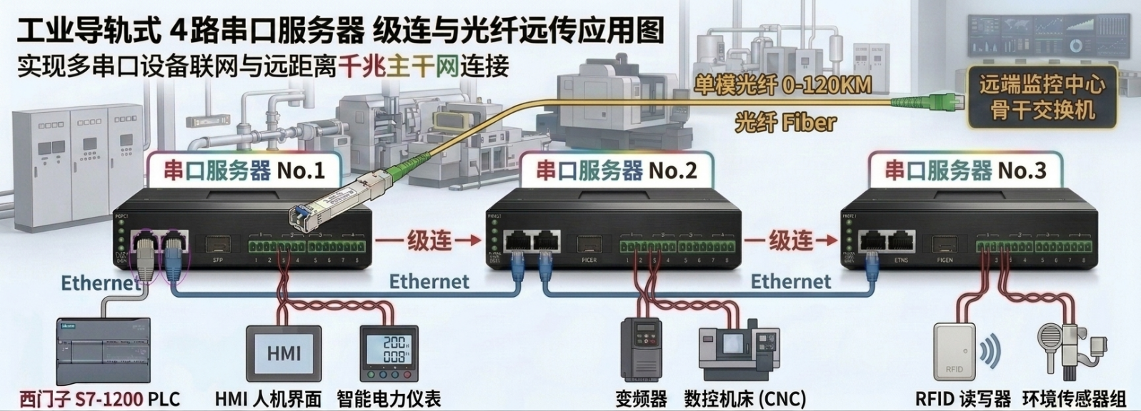 應(yīng)用場(chǎng)景一:2電1光串口服務(wù)器: 3臺(tái)設(shè)備電口級(jí)連,光口遠(yuǎn)傳