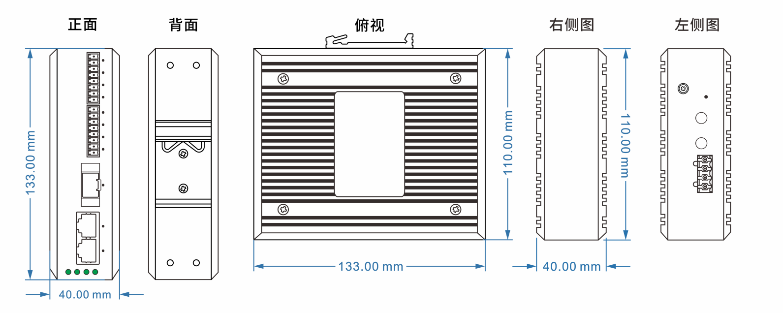 尺寸:133 × 120 × 40 mm 重量:0.65 kg 外殼:鋁合金陽(yáng)極氧化,IP40 安裝:35mm DIN 導(dǎo)軌 / 壁掛 |