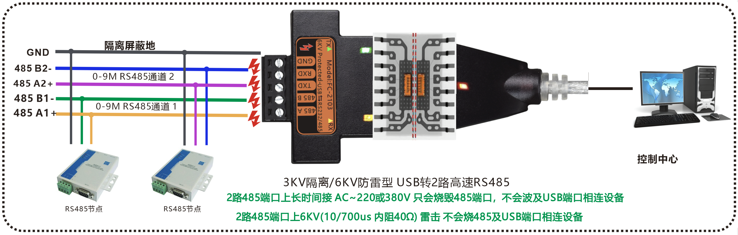 | 產(chǎn)品功能描述 | 防雷隔離型USB轉2路高速RS485轉換器,帶USB線 |